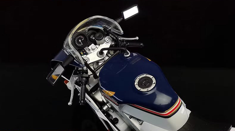 This 1:12 scale model by AOSHIMA reproduces the classic Rothmans racing livery, presenting the sharp fairing lines and compact stance of the MC18. With functional rolling wheels and steering, it offers an authentic display piece for collectors of vintage Japanese sport bikes.